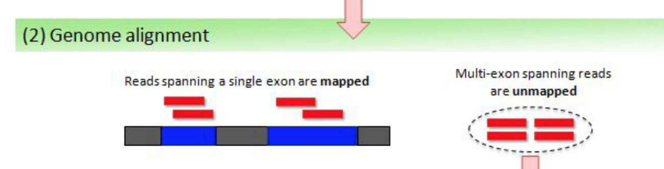 If a read extends only a few bases into one of two adjacent exons, then it often happens that the read will align equally well, but incorrectly, with the sequence of the intervening intron. To handle this problem, the appropriate algorithm detects potential splice sites for introns (GT-AG, GC-AG, and AT-AC). It uses these candidate splice sites in a subsequent step to correctly align multiexon-spanning reads.