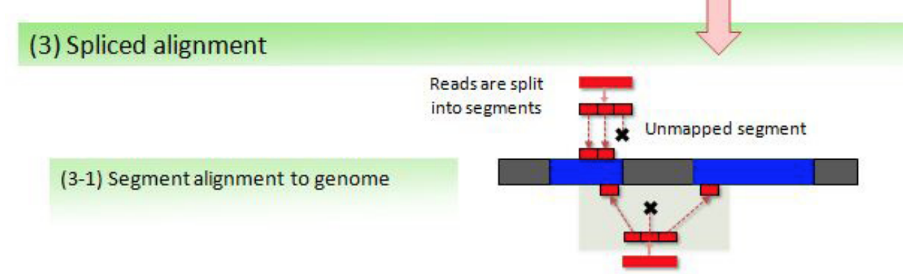 The unmapped reads are split into smaller non-overlapping segments (25 bp each by default) which are then aligned against the genome.