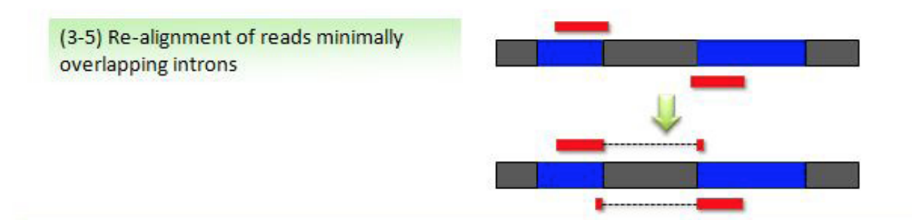After these steps, some of the reads may have been aligned incorrectly by extending an exonic alignment a few bases into the adjacent intron. TopHat2 checks if such alignments extend into the introns identified in the split-alignment phase; if so, it can realign these reads to the adjacent exons instead.