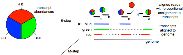 We shall, for simplicity's sake, only perform gene level quantification. Even though it has some drawbacks, it's a strategy still used by most genomic scientists. Here's what we have at the beginning of the quantification step and what we want to estimate: