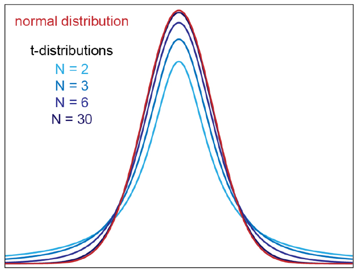 This is the ratio of two random variables so it is not necessarily normal. The fact that the denominator can be small by chance increases the probability of observing large values. In 1908. William Sealy Gosset, an employee of the Guinness brewing company, deciphered the distribution of this random variable and published a paper under the pseudonym “Student”. The distribution is therefore called Student’s t-distribution.